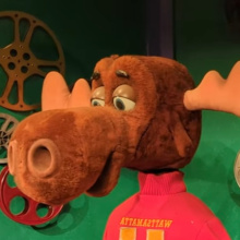 Bullwinkle, the namesake of Bullwinkle's Restaurants, first made his debut as an animatronic at the Santa Clara location and has been a part of every animatronic stage show featured at Bullwinkle's. He currently plays in the final existing animatronic show at the Tukwila location. Bullwinkle plays a banjo while sitting on a barrel. In the original show, he wears an orange winter jacket. Newer stage shows have Bullwinkle wearing a “Wossamotta U” sweater. He ordinarily performs in the Center Stage, or in the fire station of the Northwoods stage show.